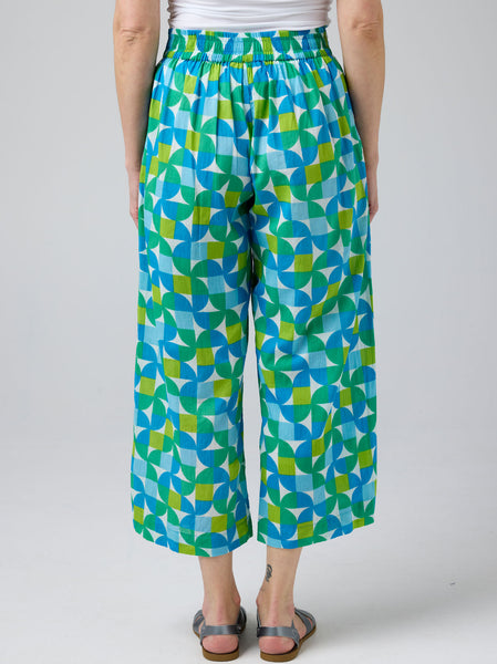 The Cake Lee Lounge Pant are cut with a draping wide-leg and feature contrasting angled seams, pockets, and hems. These pants have a shirred wide waistband and a cropped leg for a breezy summer silhouette.
