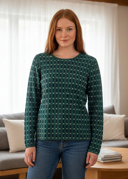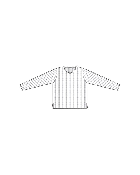 quality : 70% merino wool / 30% cottonknit : fine plain knit with vertical stripeshape : pullover with relaxed fitdetail : vertical stripe with little dot accent, the pullover has slits at the side seams