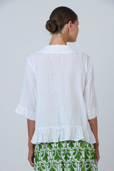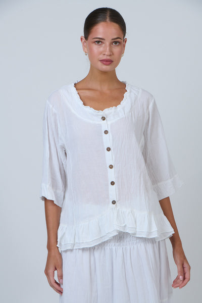 Soft ruffles and subtle texture come together in this top’s button-front design. Delicate ruffle detailing traces the scoop neckline and hem, while folded cuffs and a double-layered ruffle hem add gentle movement and charm.