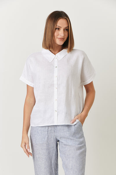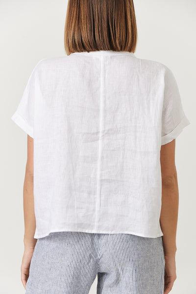 This cute boxy tee will bring some fun to your wardrobe this summer.  Oversized pockets make this top unique top stand out.   Hidden shell buttons and the subtle high low hemline add an air of elegance to this piece.  Pair this top with some linen shorts for the ultimate summer outfit.