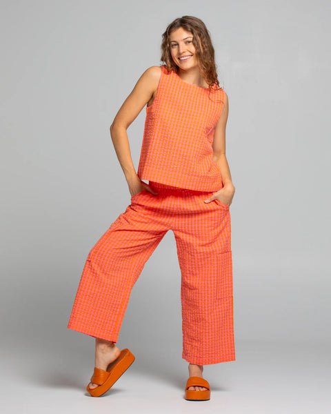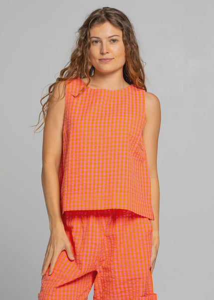 The Boom Shankar Mona Top is a super fun summer essential in our light and bright Fiore/Tangerine seersucker gingham.