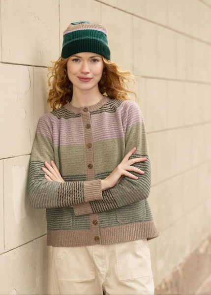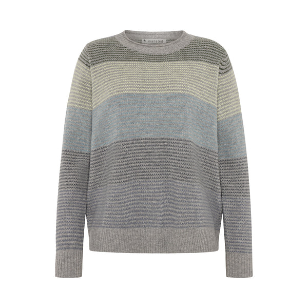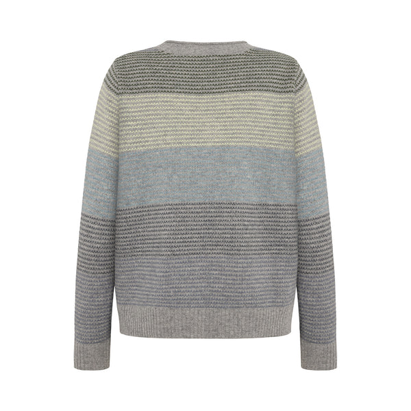 quality : 100% lambswool knit : heavy structure knitshape : pullover with relaxed fitdetail : structure knit with wide stripes, the pullover has small collar with rolling edge