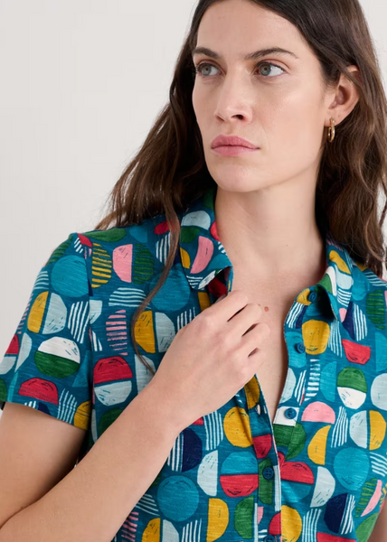 A soft and breathable organic cotton jersey dress that's perfect for busy days or lazy weekends. The button-down front has a classic shirt collar, while gathers at the waist give the skirt an easy volume. And it has pockets...