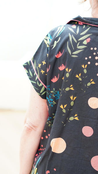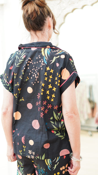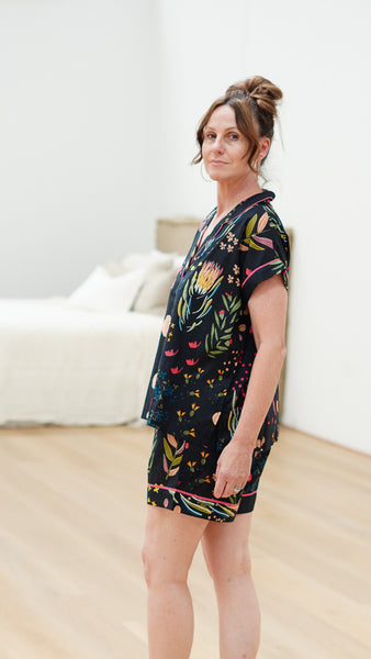 Sleep, lounge or slow down in style in our 100% cotton pj set features a botanic print on fresh turquoise base. With its relaxed fit, breathable fabric, button-up top and comfy elastic waist shorts, it's perfect for lounging or sleep.
